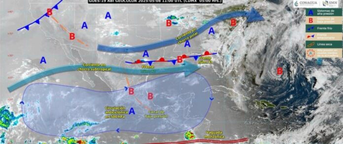 Por último, el SMN de la Conagua señaló que una circulación anticiclónica en niveles medios de la atmósfera mantendrá el ambiente caluroso a muy caluroso sobre la República Mexicana, prevaleciendo la onda de calor en zonas de Jalisco (centro, suroeste y sur), Colima (este y noreste), Michoacán (mayor parte), Guerrero (mayor parte), Oaxaca (oeste, suroeste, sur y este), Chiapas (noroeste y oeste), Guanajuato (sur), Querétaro (centro y sureste), Hidalgo (suroeste), Puebla (sur y suroeste), Tlaxcala, Estado de México (suroeste), Ciudad de México, Morelos, Veracruz (sur), Tabasco (suroeste), Campeche (centro) y Yucatán (suroeste).