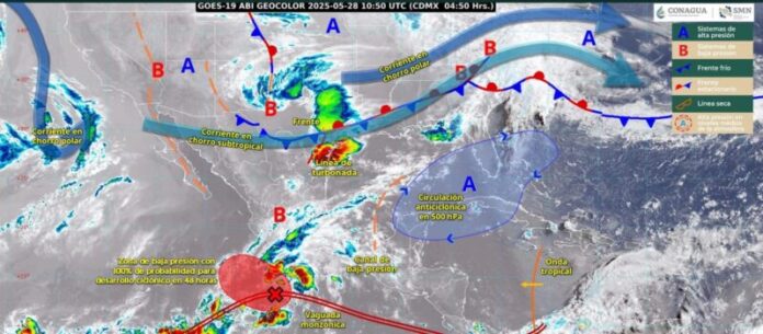 Por otra parte, un frente (fuera de temporada y en etapa de disipación), interaccionará con inestabilidad atmosférica, con la corriente en chorro subtropical y con el ingreso de aire cálido y húmedo del Golfo de México, ocasionará rachas de viento de 60 a 80 kilómetros por hora, chubascos y lluvias puntuales muy fuertes en el norte y noreste del país; así como la posible formación de torbellinos o tornados en Chihuahua (noreste) y Coahuila (noroeste).