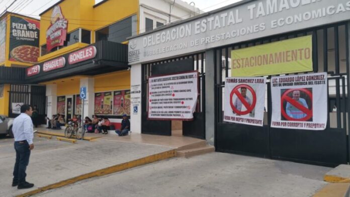 CIUDAD VICTORIA.- Esta mañana, el Frente Estatal de la Defensa de la Seguridad Social en el Estado de Tamaulipas tomó la Subdelegación de Prestaciones Económicas del Issste y exigió la destitución del subdelegado Tomás Sánchez Lara y del jefe de la Unidad Jurídica Eduardo López González.