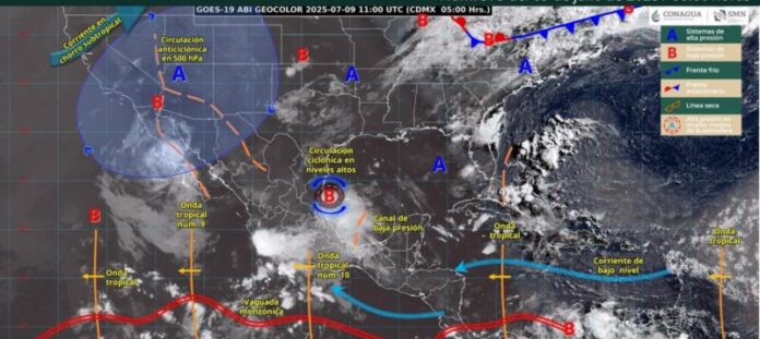 Simultáneamente, canales de baja presión sobre el norte, noreste, centro y oriente del país, en combinación con una circulación ciclónica en niveles altos de la atmósfera; aunado a inestabilidad atmosférica y el desplazamiento de la onda tropical número diez sobre el sur y occidente de México, propiciarán chubascos y lluvias fuertes a puntuales muy fuertes en estados del norte, noreste, oriente, centro, occidente y sur de la República Mexicana; con lluvias puntuales intensas en Jalisco (occidente).
