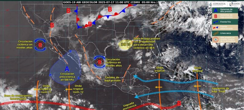 Simultáneamente, el monzón mexicano propiciará lluvias puntuales intensas en Sinaloa y Nayarit, así como lluvias fuertes a puntuales muy fuertes en Chihuahua y Durango; además de chubascos en Baja California y lluvias aisladas en Baja California Sur.