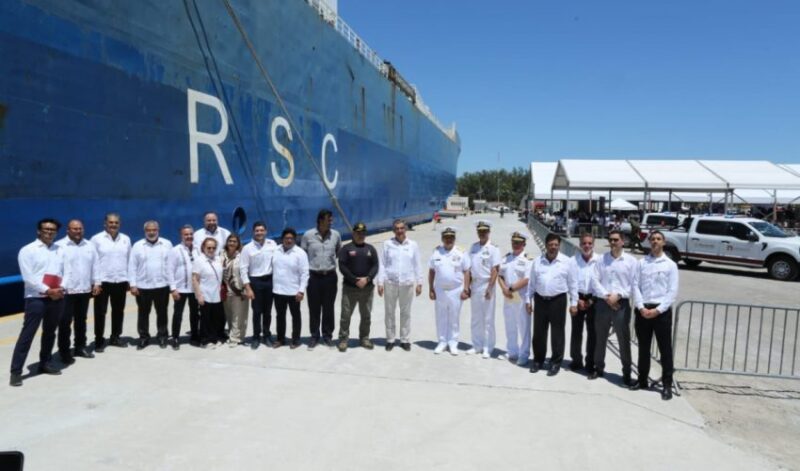 La ceremonia incluyó el banderazo de salida al embarque de los primeros vehículos que abordaron el buque Integrador, anclado en el nuevo muelle.