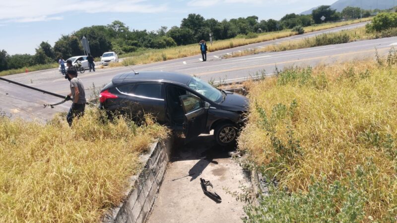 Tras ser impactado por un tráiler, un automóvil de la marca Ford tipo Focus con placas de Tamaulipas abandonó la Carretera Rumbo Nuevo y terminó por estrellarse contra la estructura de un dren pluvial.