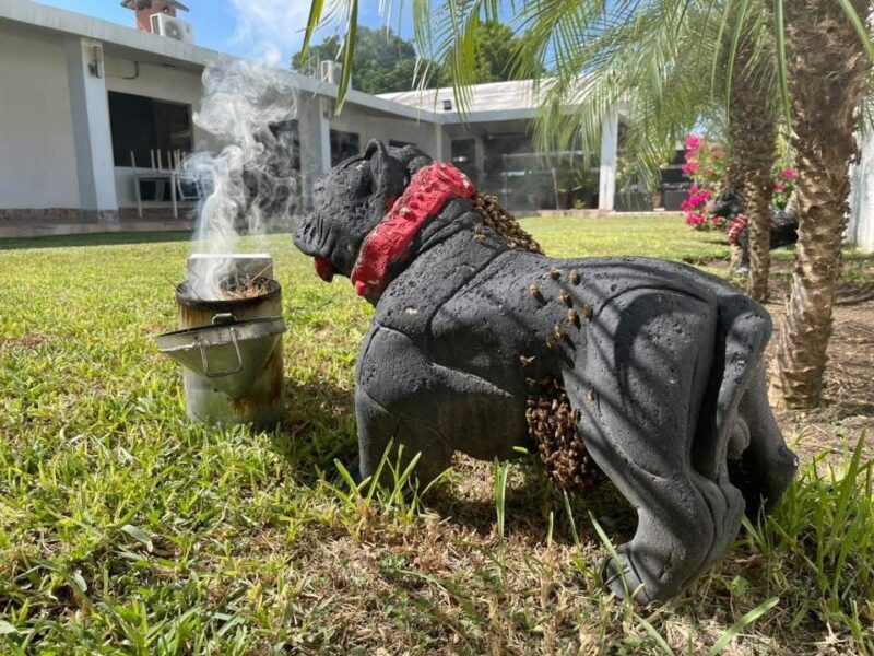 Un enjambre de abejas viajeras descansaba sobre la figura de un perro de yeso.