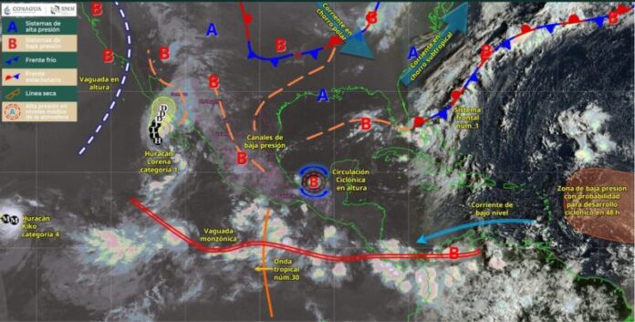 CIUDAD VICTORIA. – Para hoy, el ciclón tropical Lorena, se localizará frente a la costa occidental de Baja California Sur, y en interacción con el monzón mexicano, mantendrá lluvias puntuales torrenciales en Baja California Sur; puntuales intensas en Sinaloa, Sonora y sur de Baja California; puntuales muy fuertes en Nayarit y Durango; y puntuales fuertes en Chihuahua; así como intensas rachas de viento y oleaje elevado en la costa oriental y occidental del sur de la península, y posible formación de trombas marinas en el Golfo de California, informó el Servicio Meteorológico Nacional.