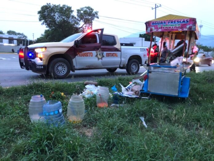 Un menor de 14 años de edad, vendedor de aguas frescas, terminó hospitalizado en una clínica de esta ciudad capital después de treparse con su triciclo al camellón del libramiento Naciones Unidas, regando toda su mercancía.