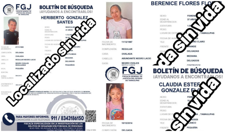 Como parte del avance en las investigaciones, la Fiscalía confirmó el hallazgo de tres cuerpos sin vida —un hombre, una mujer y una menor de edad— en un camino de terracería a las afueras de Reynosa. Los restos fueron trasladados al Servicio Médico Forense para la práctica de los exámenes periciales que determinen la causa de muerte y su plena identificación.