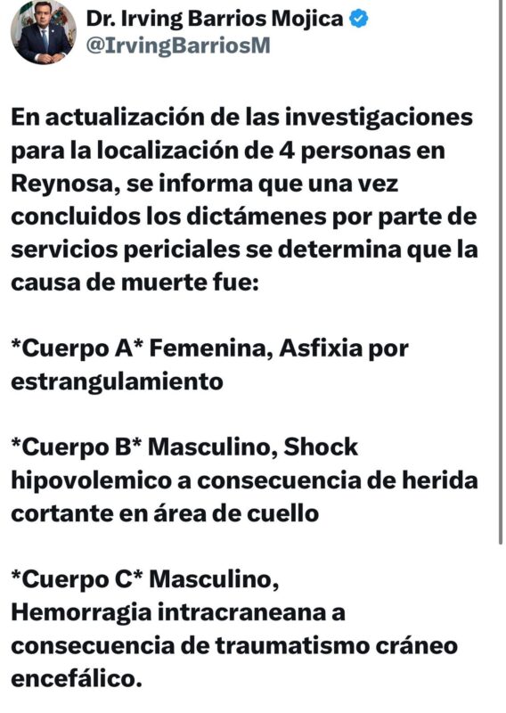 CIUDAD VICTORIA.- A través de su cuenta de X, el Fiscal General de Justicia del Estado de Tamaulipas, Dr. Irving Barrios Mojica, informó sobre los avances en las investigaciones para la localización de cuatro personas desaparecidas en Reynosa.