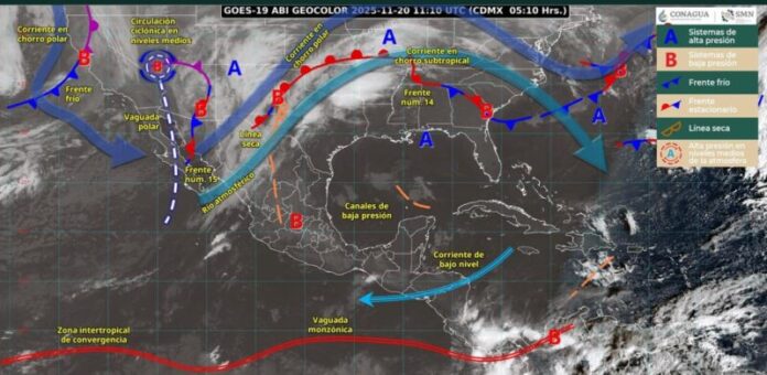 CIUDAD VICTORIA. – Este día, el frente número 15 se desplazará sobre el norte y noreste del país, en interacción con una vaguada polar, la corriente en chorro polar y un río atmosférico, mantendrán ambiente frío a muy frío; vientos muy fuertes a intensos, con rachas de 80 a 90 kilómetros por hora en Chihuahua, Coahuila y Durango; así como lluvias puntuales fuertes en Baja California (norte), Sonora (norte y este), Coahuila (norte), Nuevo León (norte) y Tamaulipas (noroeste); y chubascos en Chihuahua, Sinaloa y Durango, informó el Servicio Meteorológico Nacional.
