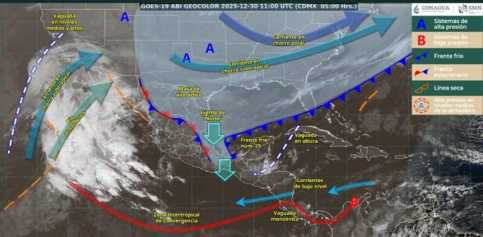CIUDAD VICTORIA. – En el transcurso de este día, el frente frío número 25 se extenderá sobre la Península de Yucatán y mantendrá interacción con una vaguada en altura, ocasionando lluvias fuertes a muy fuertes en dicha región, además de lluvias puntuales intensas en el oriente y sureste del país; con lluvias puntuales torrenciales en zonas de Oaxaca, Veracruz y Tabasco.