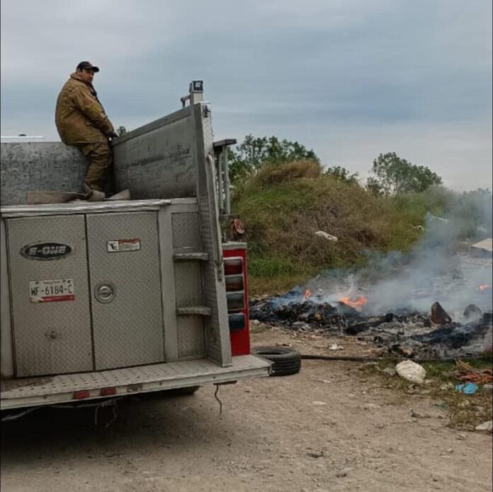 CIUDAD VICTORIA. – Elementos del Cuerpo de Bomberos atendieron el reporte de un incendio de llantas, pastizal y basura en el Fraccionamiento San Miguel.