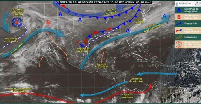 El ingreso de humedad favorecido por la interacción del río atmosférico y una circulación ciclónica en altura, en el noroeste del país, ocasionarán lluvias puntuales fuertes en zonas de Baja California y Sonora, y chubascos en zonas de Chihuahua.