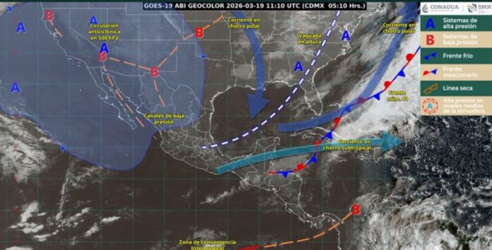 Por otra parte, una circulación anticiclónica en niveles medios de la atmósfera mantendrá ambiente seco y estable en el norte y noroeste del territorio nacional, propiciará el inicio de una onda de calor en Baja California Sur (norte), Sonora, Chihuahua (suroeste), Durango (noroeste y suroeste), Sinaloa y Nayarit (norte y sur).
